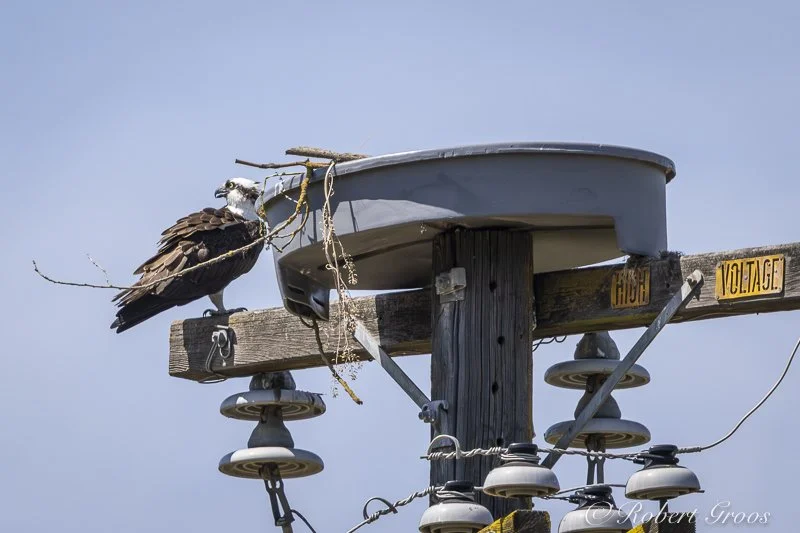 Another twelve months elapsed. I happened upon Ospreys constructing a nest on, of all places, an electric power pole. With human encroachment upon land bordering rivers, power poles (as well as cellular towers) have become as ubiquitous as the homes and businesses they service. Securely planted into the ground, and having one or more crossbeams, it is no surprise that such frameworks provide an attractive structure that Ospreys have adapted to their nesting needs. These poles often work out well for the Ospreys. much to the dissatisfaction of the power companies.