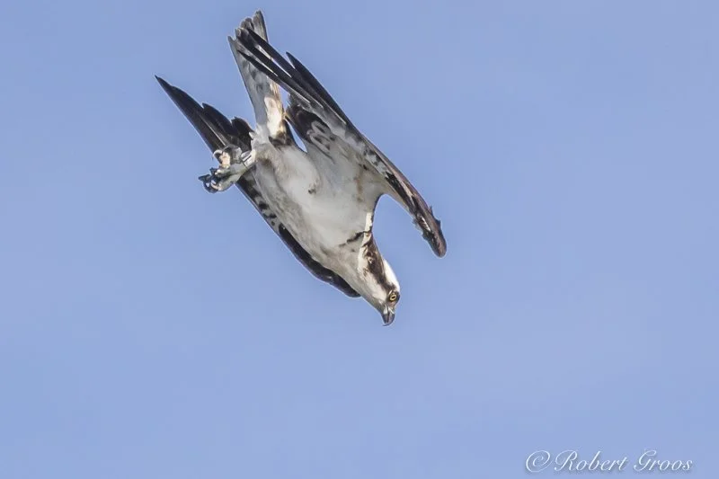 Six or seven miles further down the river, an Osprey will occasionally circle overhead, then drop out of the sky like a scud missile. Seconds before hitting the water, it will thrust its legs forward to grab a fish. Unlike humans who hold their nose when jumping into the water, Ospreys have a closable valve in their nostrils to prevent water from entering airways. With spiny pads on its feet and reversible toes to securely grip a slippery fish, its success rate averages about 75%, far superior to the Bald Eagle whose fishing success does not compare. Once in the air, the Osprey may position its catch in line with its body to reduce aerodynamic drag. Catch or no catch, the sight of an Osprey is always a thrill.