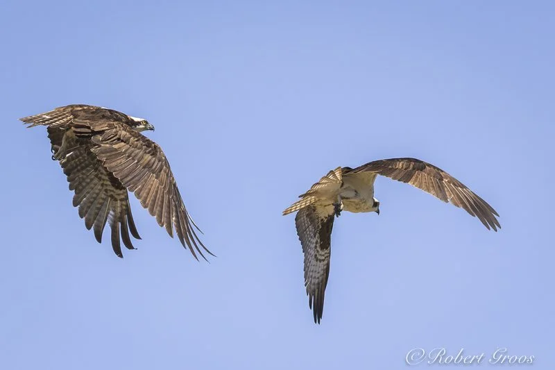 Unlike birds of stealth, such as Cooper’s Hawks who are maneuverable in close proximity to tree branches where they lurk, Ospreys seek open space. Having a long, narrow wingspan (about 5.5 feet), Ospreys are adapted for flying in wide arcs. Open space facilitates landings and departures from their nest, and offers a clear view of the approach of aerial predators such as other raptors and ravens, as well as dangers on the ground.