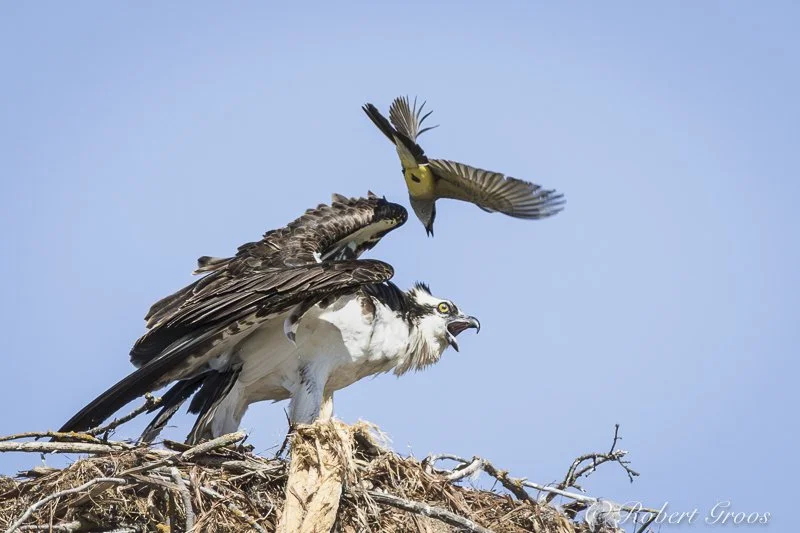 A Western Kingbird mobs an Osprey nest