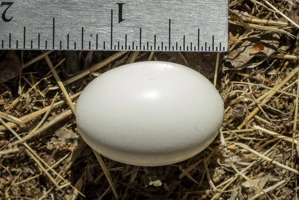 The oddity of this discovery sparked further investigation. The size, shape, and white color of the egg suggested a dove, Mourning Dove (Zenaida macroura) or Eurasian Collared-Dove (Streptopelia decaocto). I leaned toward the Eurasian Collared-Dove because of a slight gloss on the shell, as well as their occasional presence around my property in the early morning. They perch high in the trees or on telephone lines and utility poles.
